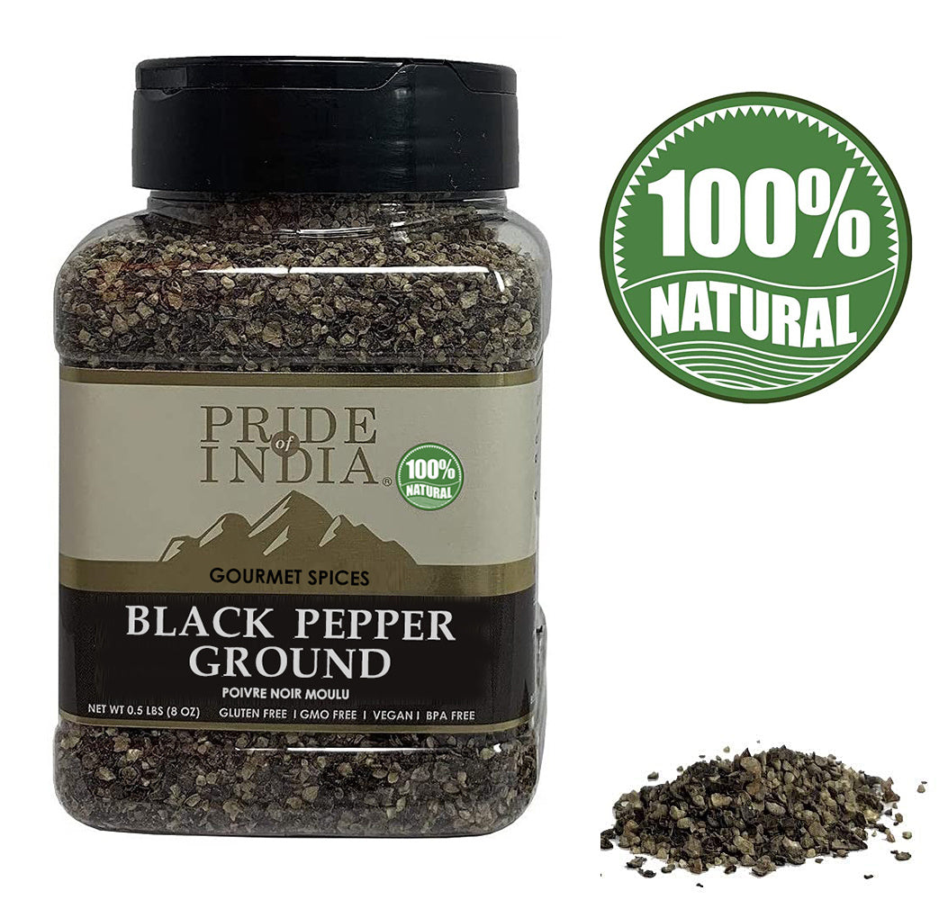 Pride of India – Black Pepper Ground – Ideal for Gourmet Dishes/ Soups/ Stews/ Rubs – Fresh & Preservatives Free – Warming Spice – Easy to Store – 8oz. Medium Dual Sifter Jar